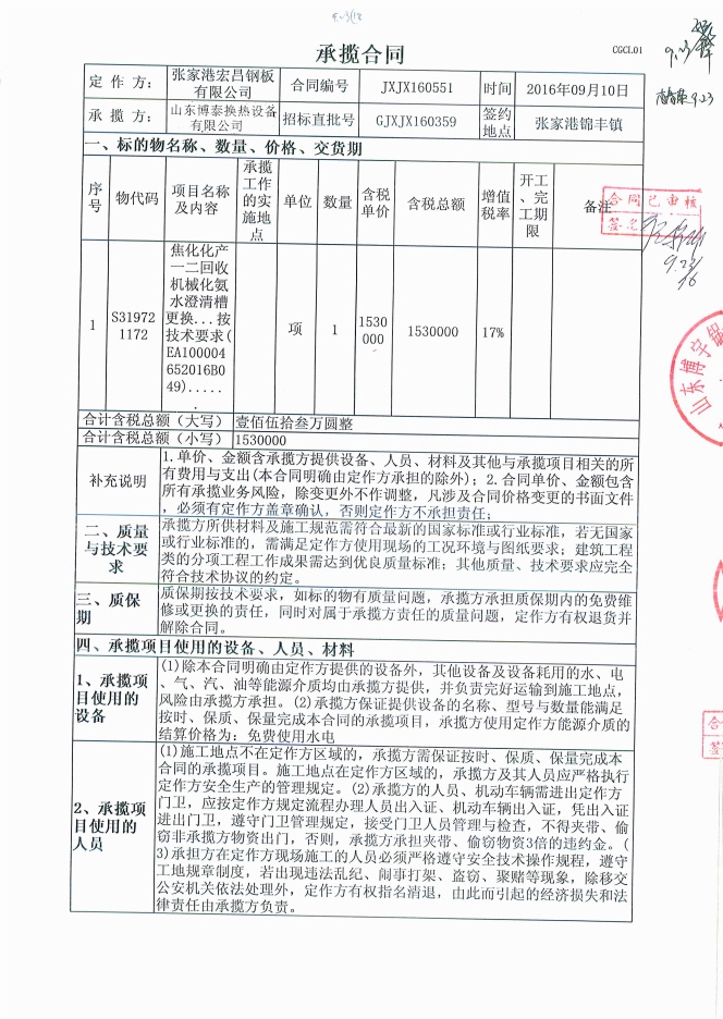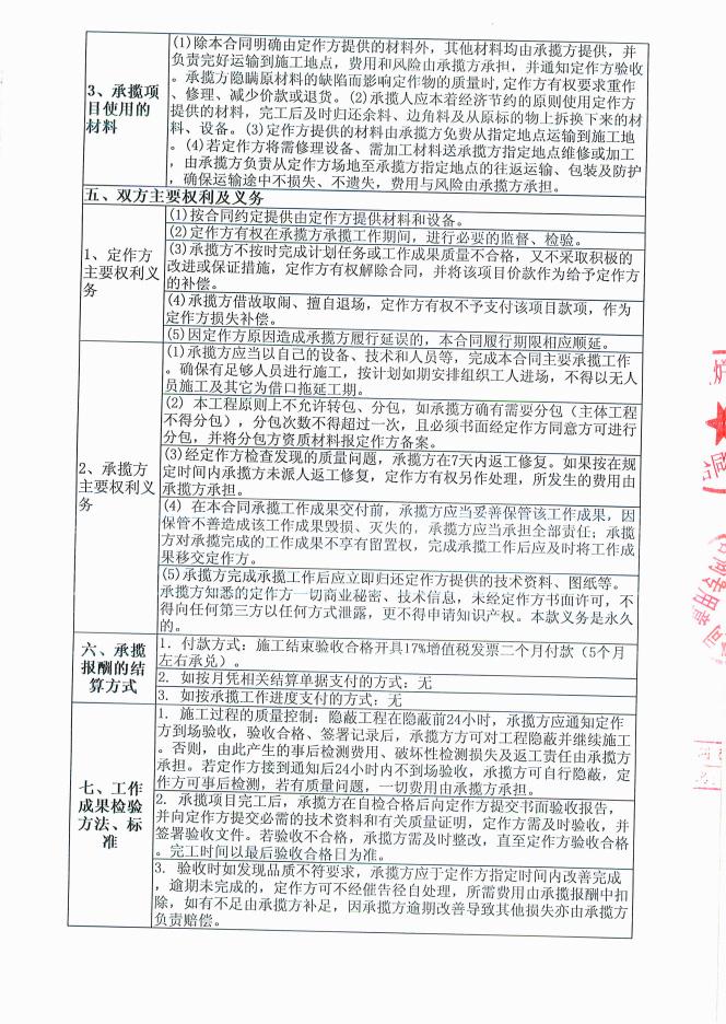 4、乙方不得将工程转包给其他单位,乙方在接收甲供设备及钢材需与甲方办理相关手续,乙方在施工完毕后将所有余材全部移交甲方,并办好交接手续,一律不得将余材出售或移做它用;